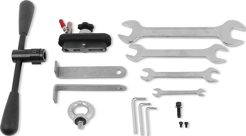 - Комплектуется 7-мью крепежными болтами, 4-мя рожковыми ключами, 3-мя угловыми шестигранными ключами, распорным болтом-головкой, рым-болтом, 2-мя съемными ножками-упорами, 4-мя юстировочными болтами, рукояткой-штурвалом, дополнительным упором, переходной плитой, комплектом вакуумного крепления, 2-мя транспортировочными колесами